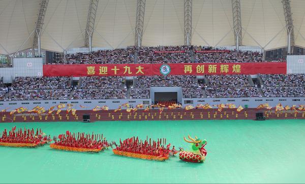 开幕式当天,院党委副书记孙彤、副院长罗向东亲自带队,全体学工人员,近千名参演学生,四千余名观看学生,搭载120辆公交汽车,浩浩荡荡开往怀化体育馆,去参加这一场体育盛会。开幕式表演共有《梦想》、《奋进》、《拼搏》、《幸福》四个篇章,我院学子是第二个篇章《奋进》的表演单位,演出时长8分钟,融入了传统龙舟、大鼓、帆旗、传统武术等表演元素,气势恢宏的精彩演出赢得了全场观众的阵阵掌声。