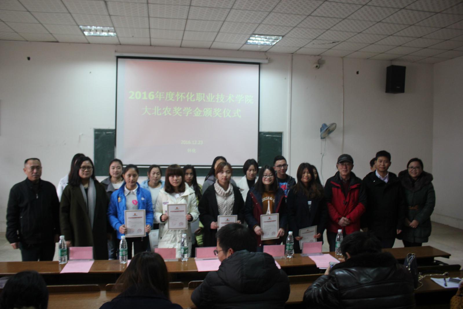 1223日下午,我院在梯一教室举行2016年度大北农励志奖学金颁奖仪式。副院长张圣喜、教务处处长罗毅华、湖南金色农华公司经理罗立文出席仪式,大北农股份有限公司工作人员、环境与生物科技系全体老师及学生代表参加了本次颁奖仪式。